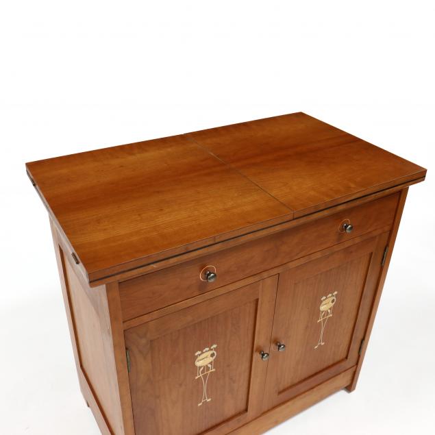 Circa 2000, hinged top with black laminate drinks surface, single drawer with copper inlay, with two hinged panel doors, mixed wood inlays, with shelved interior, on casters, labeled.