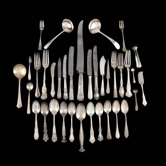 (52) pieces including: (6) Gorham "Cambridge" forks (7.75 in.); (2) Reed & Barton "La Reine" forks (8 in.); (3) assorted forks; (9) assorted teaspoons; (2) Whiting "Violet" butter knives; (14) assorted flatware pieces; (15) assorted knives; and a Shiebler "Sandringham" spoon (7 1/8 in.). Various monograms and engraving.
