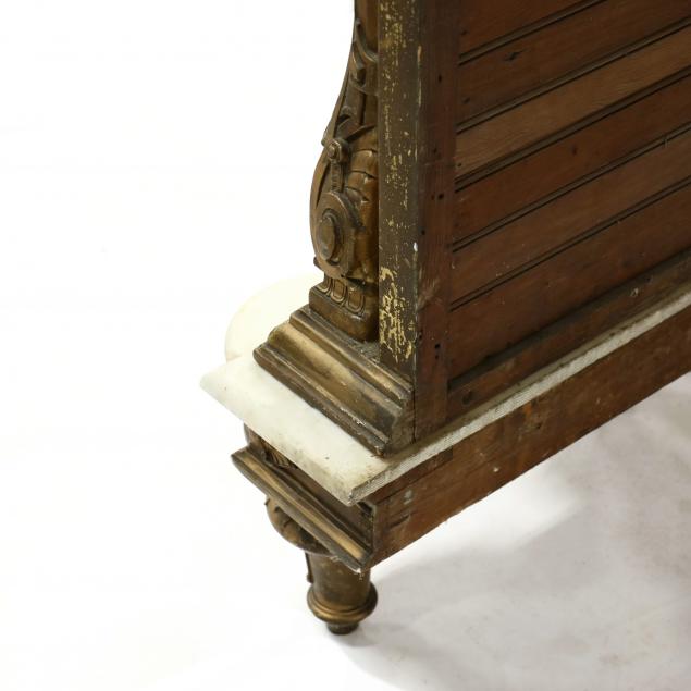 Circa 1870s, three-part form, base with shaped conforming white marble and raised on three legs, surmounted by a large frame consisting of a cartouche with shield, stiles with fluted three-quarter columns, and other architectural embellishments.