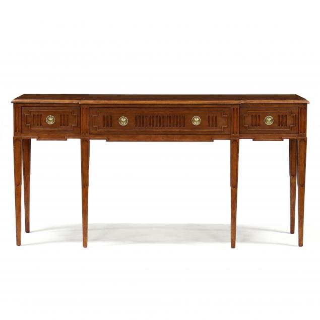 Late 20th century, block front form with three stop fluted drawers, on square tapered legs with recessed panel design, labeled.