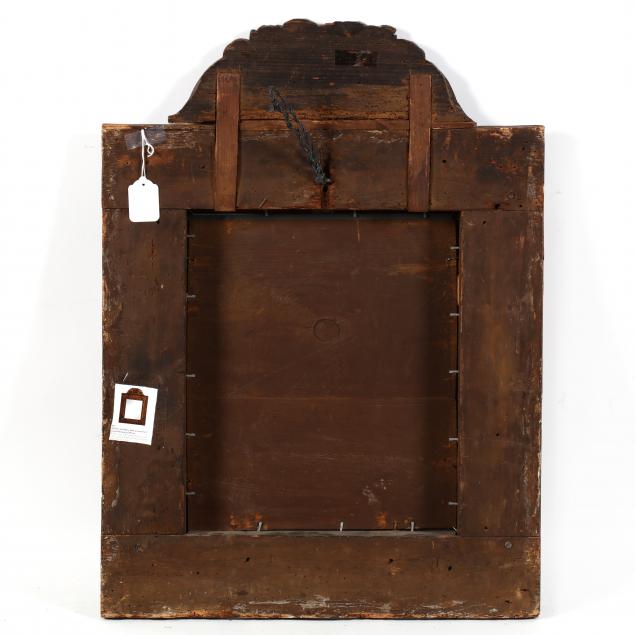 Circa 1700, cushion frame and crest with leaf and floral inlay, later glass.