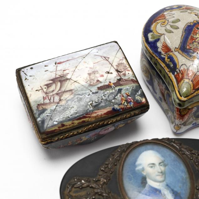 The first a gilt hinged enamel decorated trifle box depicting a maritime theme and with floral details (1.25 x 2.5 in.) (lid with cracks; some enamel loss); the second a heart-shaped porcelain painted trifle box (some paint loss); the third an oval hinged lacquer snuff box with ormolu mounts centered with a portrait of a gentleman (1 3/16 x 3.5 in.) (with loss to inner rim).
