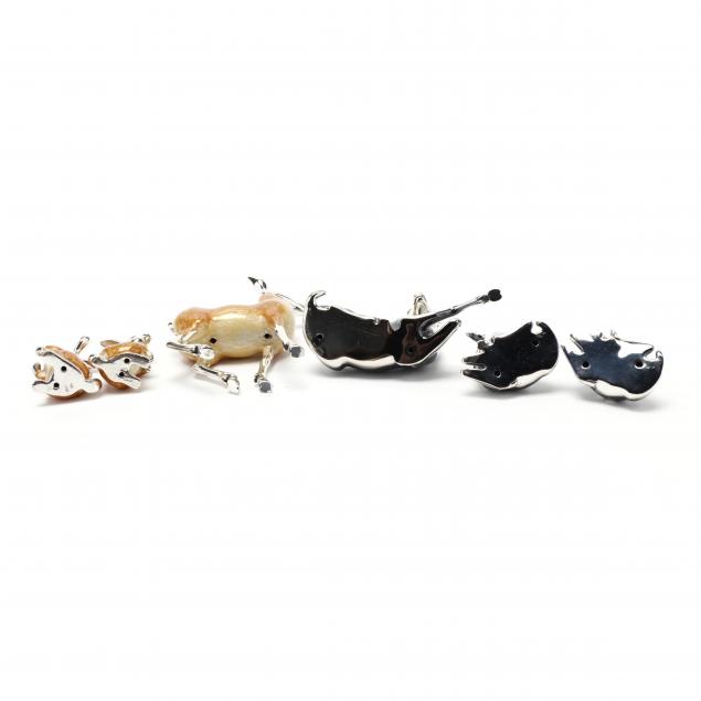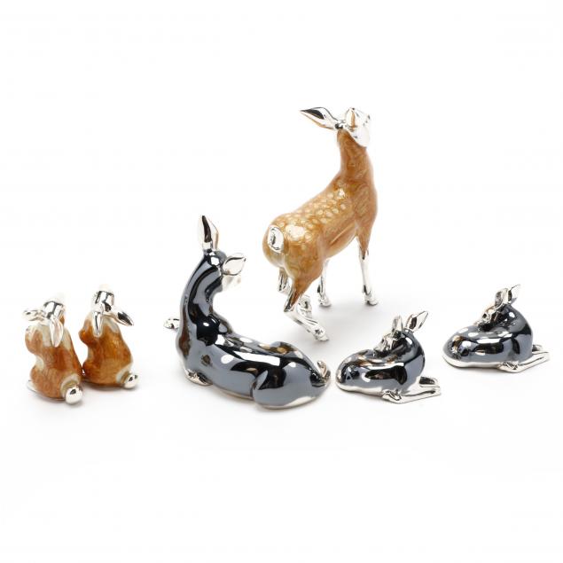 Italian, 20th century, made for Scully & Scully, including a standing enameled deer, three recumbent patinated spotted deer and two standing enameled rabbits, marked.