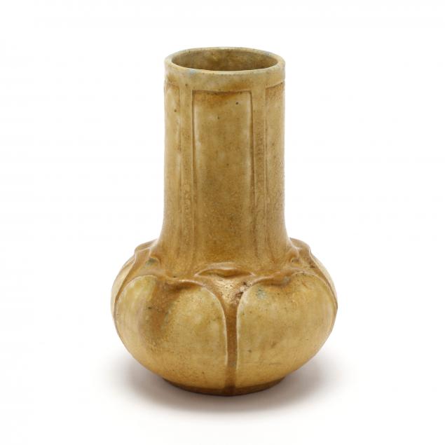 1920s, with five carved panels, bulbous base with six leaves, matte golden yellow glaze which partially covers the bottom. No mark visible.