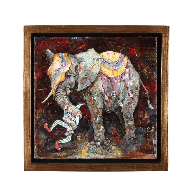 Mixed media on panel, signed at lower right, inscribed on the verso, presented in a gilt floater frame.