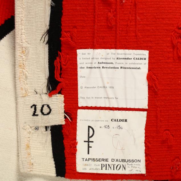 Hand-woven wool tapestry, 1975, with woven signature "Calder" lower right and numbering "20" (edition of 200) on the reverse, hand woven by Pinton Frères, Aubusson, France and bears their mark "PF" lower right, tapestry retains artist-signed, numbered, and inscribed labels, with sleeve for wall-hanging display, accompanied by original paperwork.