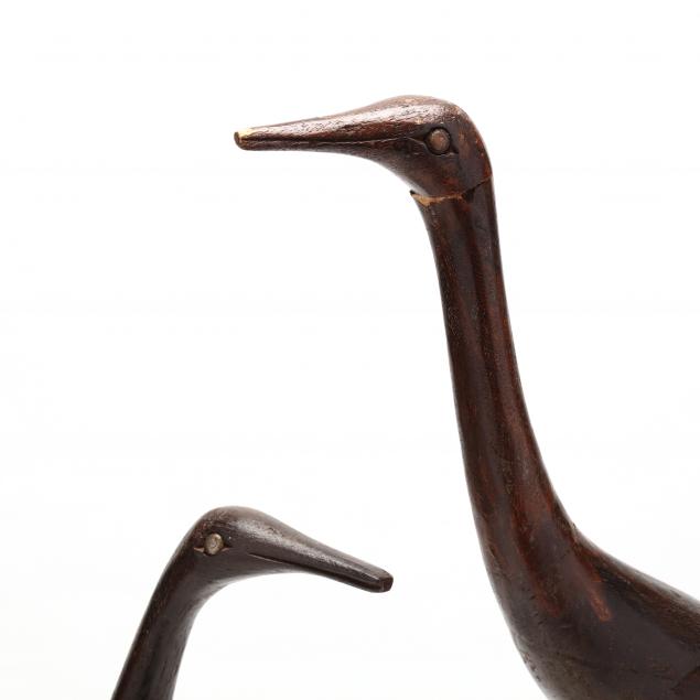 Both carvings with old surface patina showing minor wear and scuffs; the larger bird has repairs to its neck.