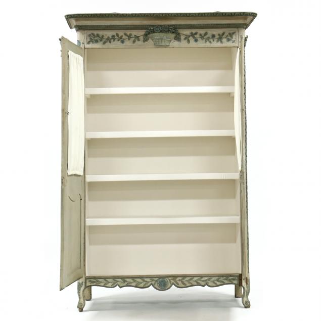 18th century, later painted surface, cove molded cornice with relief carved basket frieze, two hinged wire panel door with later woven curtains, fully lined interior, with four fitted shelves, raised on whorl feet.