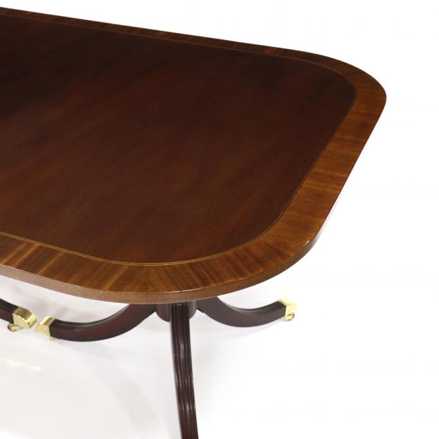 Late 20th century, mahogany with light and dark wood line inlays, rectangular top with banded and triple line inlaid edge, on urn form pedestal with molded downswept legs, on brass casters, labeled, with 3 leaves.