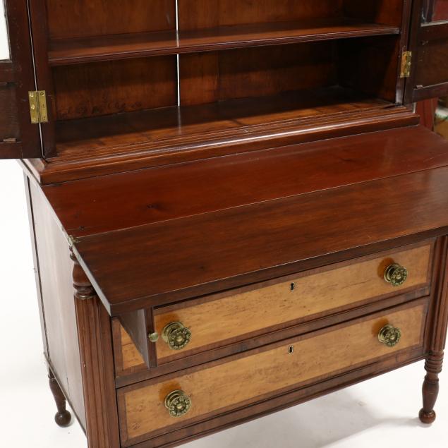 Circa 1830, two-part form, mahogany and bird's eye maple veneers, white pine secondary, uppercase with two hinged astragal molded doors with shelved interior, lower case with slant front writing surface, over three graduated cockbeaded drawers with geometric banded inlay, flanked by reeded stiles, on turned legs.
