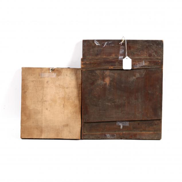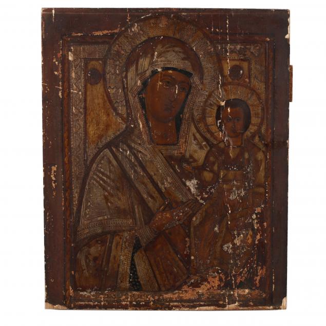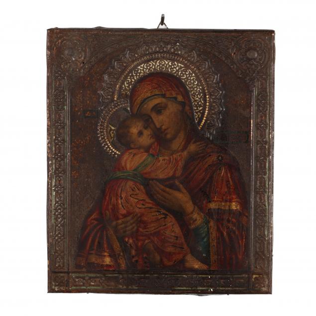 First half of the 20th century; the first with painted depiction of the Madonna and Child with hand-punched and stippled decoration (DOA 17 x 13.75 in.) (chipping and rubbing to surface); the second a chromolithograph laid on panel of the Madonna & Child with pressed metal oklad (12.25 x 10.25 in.) (rusting to metal, surface grime).