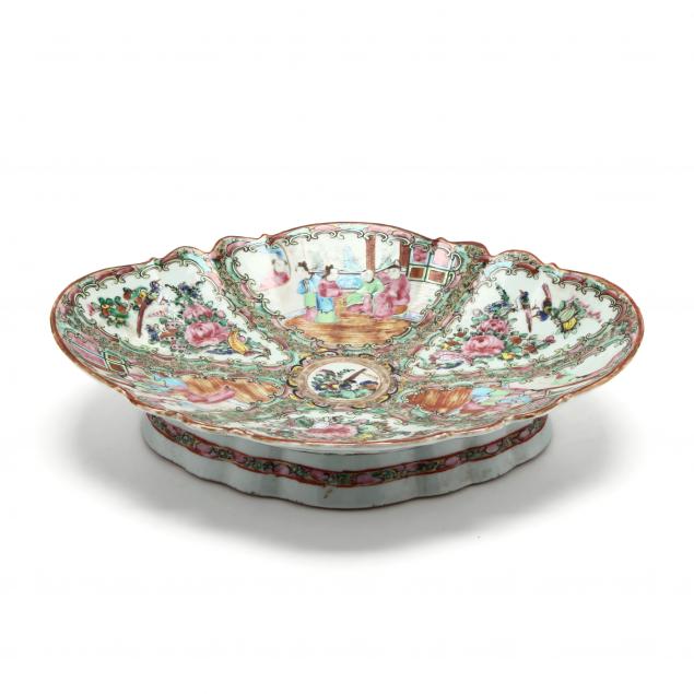 19th century, shaped concave form decorated with alternating panels of figures and foliage, underside of rim with painted floral decoration.