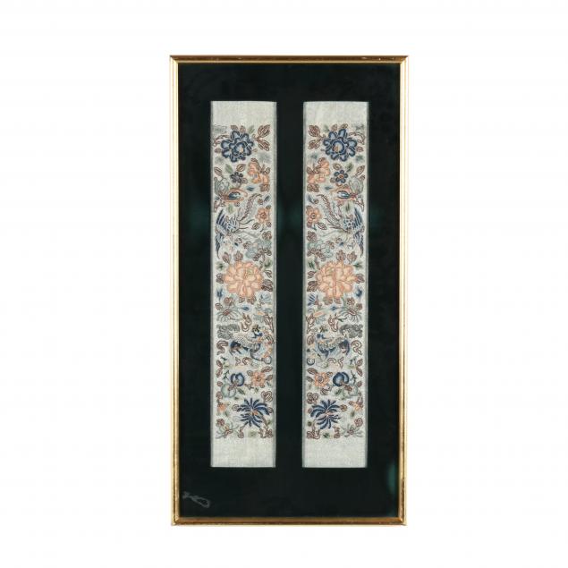 19th century or earlier, two panels of highly detailed mirrored embroidery featuring phoenixes and foo dogs amidst large flowers mostly executed in the "forbidden stitch," golden thread throughout the two panels, framed under glass, not examined outside of the frame.