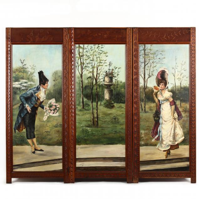 Oil on canvas laid on Masonite, early 20th century, unsigned, the scenes include figures in 18th century dress, the carved and stipple decorated frames in the Arts & Crafts style.