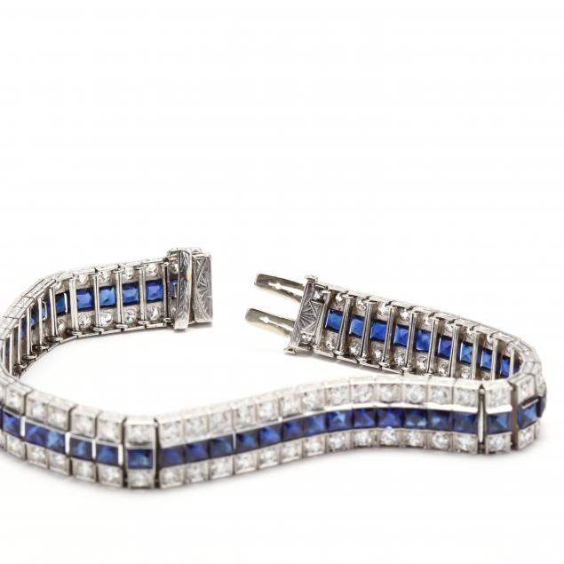 Bracelet with articulated rectangular links, centering on half bezel set square cut synthetic blue sapphires and framed on each side by bead set old European cut diamonds weighing approximately 4.59 total carats (H-I color, SI-I clarity), mount with milgrain detailing and engraved motifs, testing platinum.