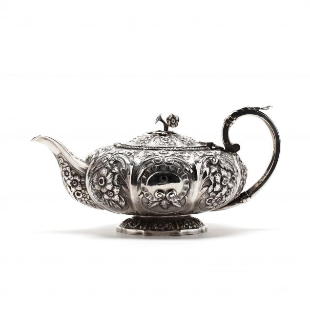 Mark of James Le Bas, Dublin (1826 and 1827) hallmarks, the three piece set including a teapot (5.5 in.), sugar bowl, and creamer; each piece profusely decorated by hand with floral and scroll motif against a scaled and stippled ground, with period engraved family crest and coat of arms featuring crescents and stags.