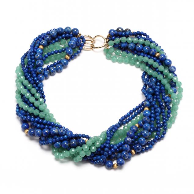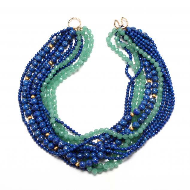 The eleven strand necklace comprised of lapis beads (4.0mm and 8.15mm) and faceted aventurine quartz beads (6.0mm) and with gold bead accents, completed with hook and clasp stamped 14KT.