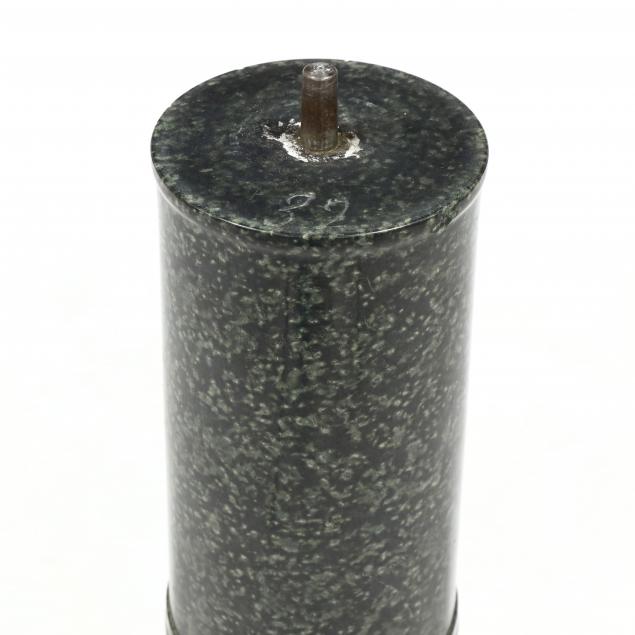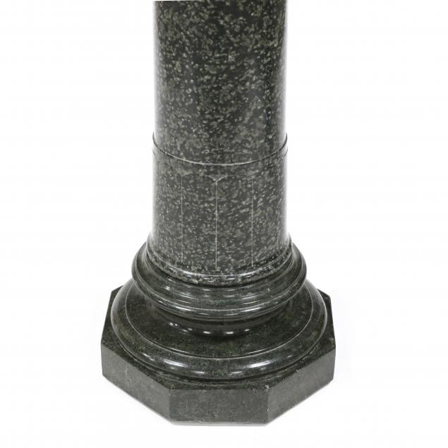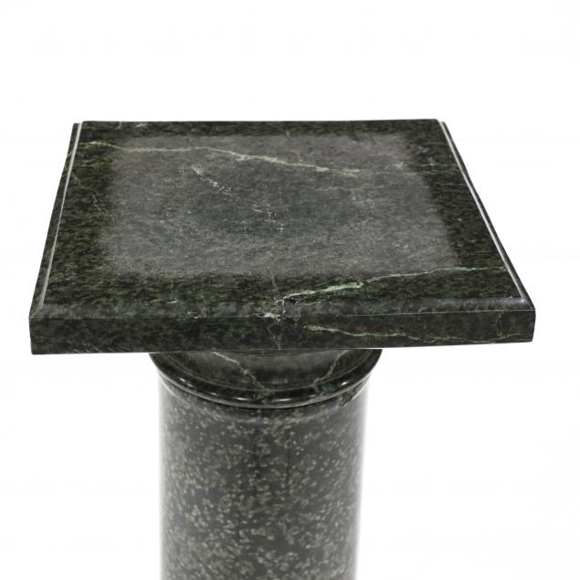 Early 20th century, solid green marble, three-part form, square rotating top with molded edge, turned standard with paneled base, on octagonal plinth.