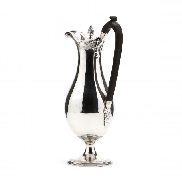 With unidentified "E.F" sponsor's mark in a rectangular punch, London (1786) hallmarks, elegant elongated baluster form with period bright-cut engraved coat of arms to belly below spout, ebonized handle, with further bright-cut engraving to rim, hinged cover, and foot.