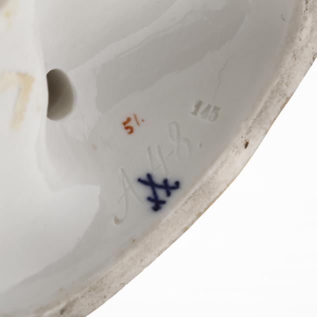 The first is a 19th-early 20th century Meissen figural of putti adorning themselves with flowers, underglaze pommel crossed swords on the underside, inscribed "A 4-8" and stamped "145" (5.5 x 4.75 in.) (small petal and leaf nicks); the second is a Meissen style grouping of Hercules wearing the Nemean lion head adornment surrounded by warrior putti, faux crossed swords mark and stamp D-29 on the bottom (repair to Hercules' foot; drum sticks broken off) (7.75 x 7 in.) (unidentified mark).