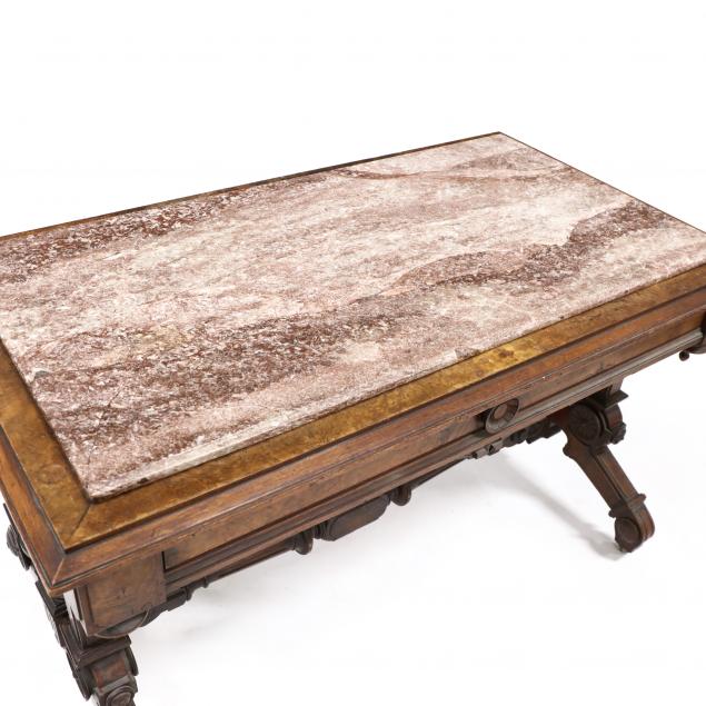 Late 19th century, inset rouge marble top with beveled edge, burlwood veneer accents, single raised panel drawer, with drop finials, on trestle form base with stylized rosettes and urns, on brass casters.