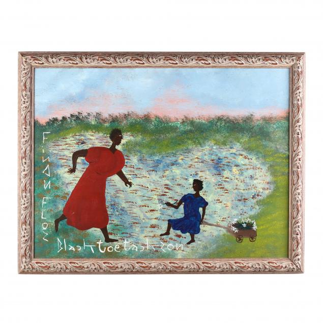 Acrylic on plywood, a woman and a child in a grassy field, the child pulling a wagon of picked blossoms, signed along the bottom, framed.