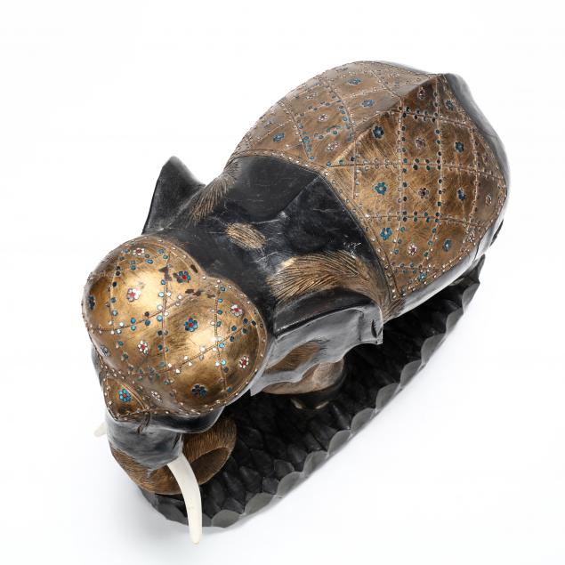 Late 20th century, carved from a single piece of wood, with gilt and painted highlight with mirrored and glass ornamentation, labeled "Made in Thailand for Lineage Home Furnishings".