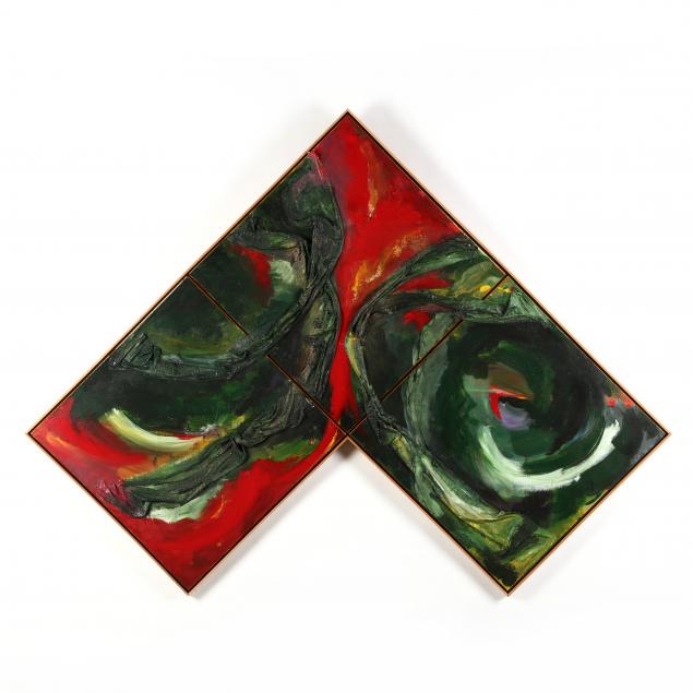 Mixed-media triptych, with elements of paint and fabric on custom canvases that are presented in single custom frame, signed, retains artist's information to canvas verso.