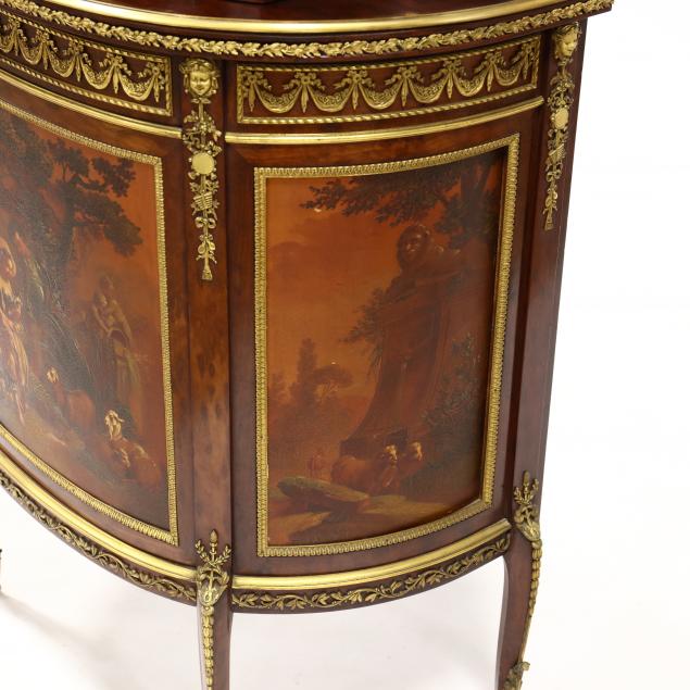 Early 20th century, two-part form, mahogany, with finely cast and well detailed ormolu mounts, upper case with bowed beveled glass panels, hinged door with glass shelf interior and velvet lining, lower case with single drawer, and hinged cabinet door featuring three painted panels with fitted drawer interior, raised on cabriole legs with cast paw mounts.
