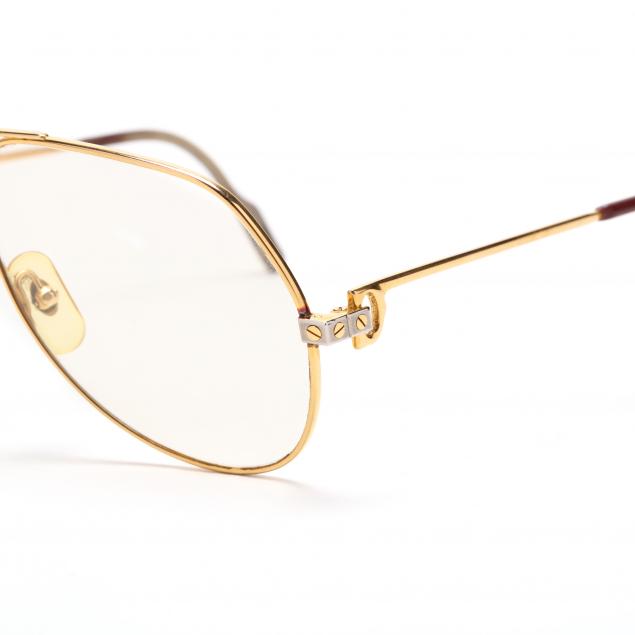 Made in France, clear lenses (not prescription), the first pair has a gold tone frame with rosewood temples, marked "135b" (very good condition, not scratched); the second pair are aviator form with gold tone frame marked "130", cognac colored plastic ear pieces (ear pieces very worn; no noted scratches). Boxes and cases by Cartier but may not be original to the enclosed glasses.