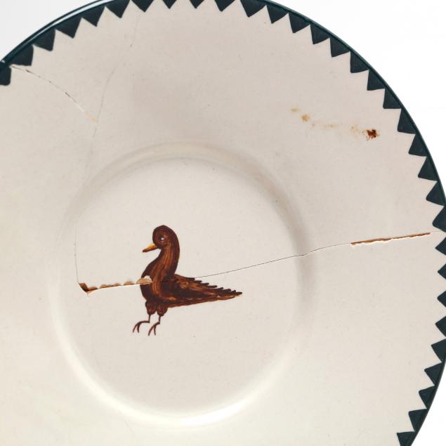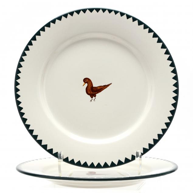 Italy, late 20th century, each in white glaze with painted brown bird and dark green triangular border, including (14) dinner plates 11.25 in., (14) bullion under-plates 7 in., (14) crescent shaped bone dishes 10 in., (14) salad plates 8 in., (8) teacup saucers 6.5 in., (13) double handled bullion cups, (8) teacups, lidded soup tureen with ladle and underplate, drain bowl, each marked "Grazia - Deruta, Made in Italy, A.C., Made for Rushton W. Hays"