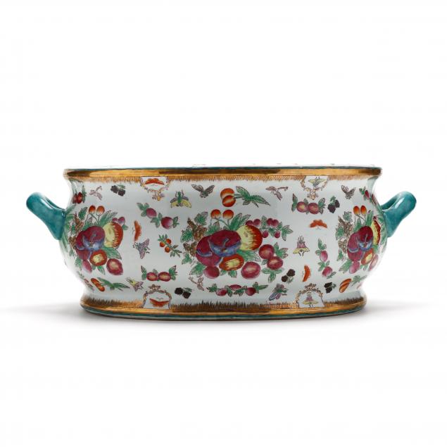 Late 20th century, oval double handled form with painted decoration to interior and exterior of fruit and insects with gilt highlight, pseudo mark to underside.