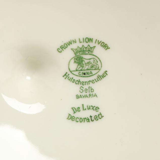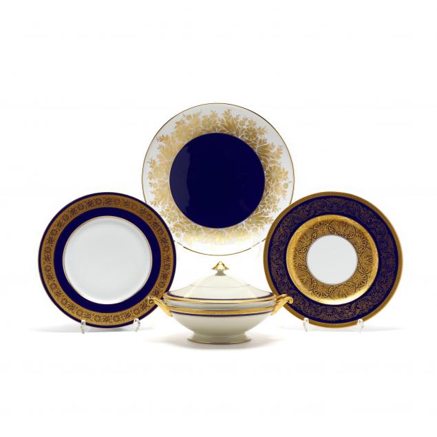 Bavaria, two cobalt and gilt plates, one with large chip to the underside (10.5 in.); a deep footed bowl (2.5 x 12.5 in.); a large rectangular tray (20.5 in.); a covered entree marked "Crown Lion Ivory" (6 x 10.5 in.).