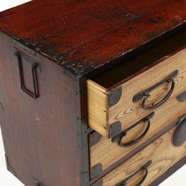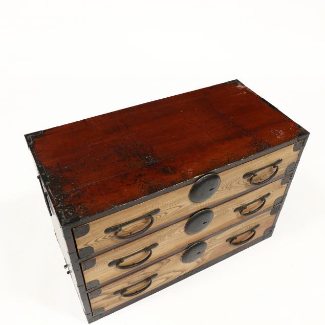 Late 19th century, yew wood and pine, dovetailed case with metal mounts, three drawers, on flush base.