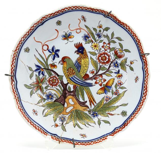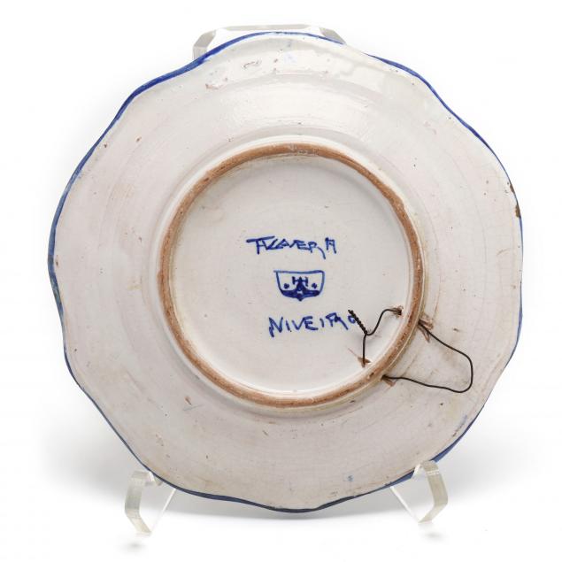 To include: a large faux wine cooler, made in Italy, possibly Vietri (base chip); four French Niveiro plates (6.75 in.) (one broken and glued); two French plates (one broken and glued) (9.5 in.); a covered jar, probably Italian (break and repair to rim); a tall pitcher with lion coat-of-arms (crazing) (11.25 in.).