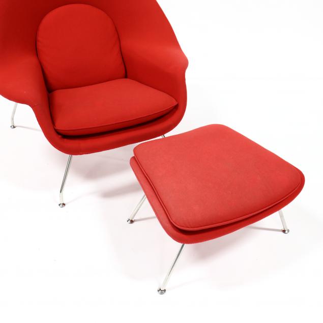 Contemporary, red wool upholstery, chair with loose back cushion and velcro seat on polished steel legs, together with a conforming ottoman, unmarked.