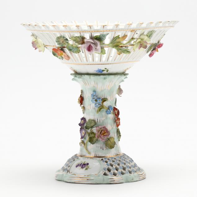 A Carl Thieme Dresden compote, circa 1900, basket form with flowers applied to the exterior (9 in.) (two exterior flowers with petal loss); an urn on pedestal, faux beehive mark (13 5/8 in.); a 20th century "Blue Onion" Meissen compote (8.5 in.).