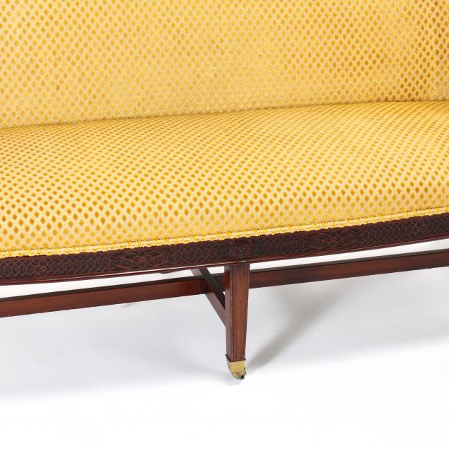Circa 1800, pronounced camelback, scrolled arms, bowfront seatrail with applied Chinese Chippendale fretwork raised on six legs, the front three molded and tapered, on stretcher base, with casters.