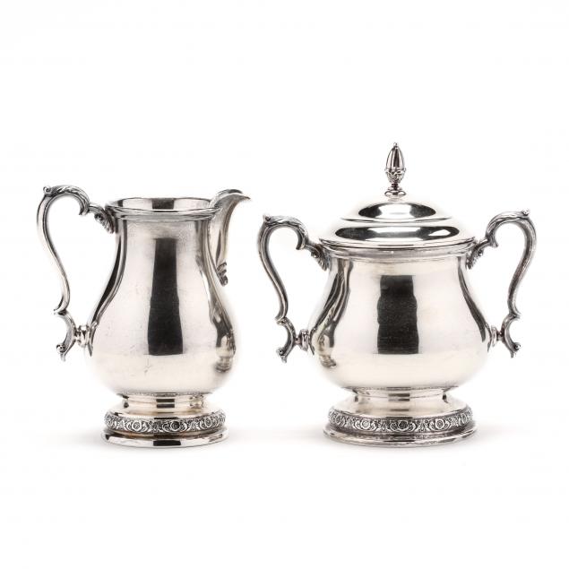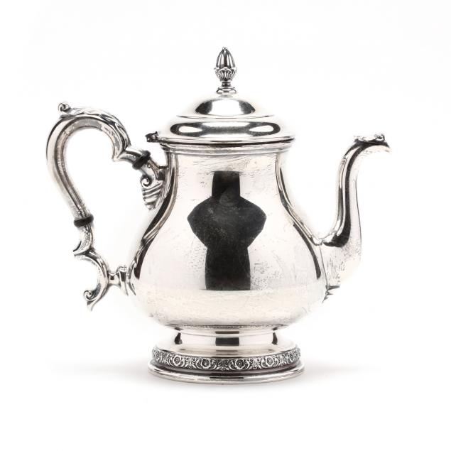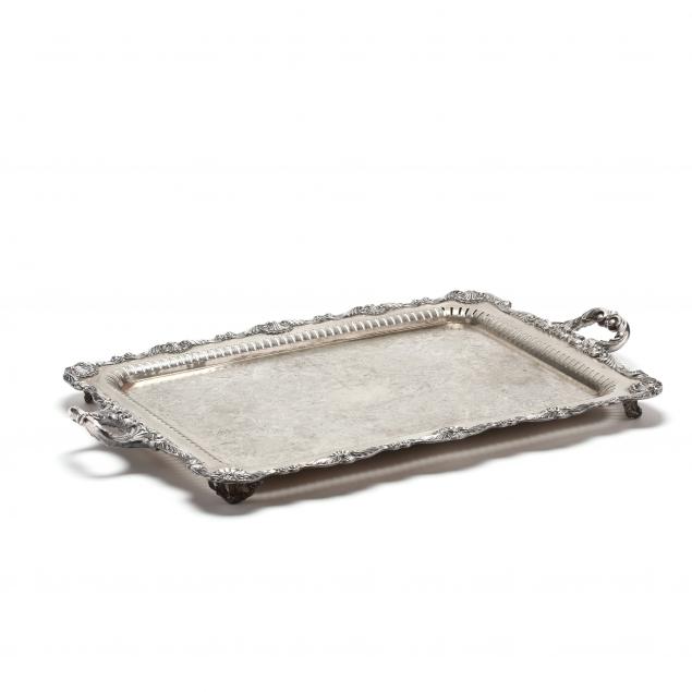 The five piece set including: a coffee pot, model number C366, 9 cup capacity (11 in.); teapot; sugar bowl with cover; creamer; and waste bowl. No monograms, sold with a large vintage silverplate tray.