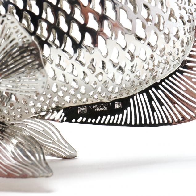 Silverplate, 20th century, including two fully hallmarked fish, each with inset onyx eyes, delicate lacy piercing to simulate scales; the third a small frog, unmarked.