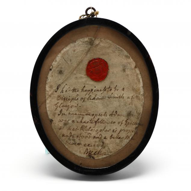 Early 19th century, mounted in an oval wooden frame, its glass-covered back holds an inscribed sheet with wax seal, reading: "