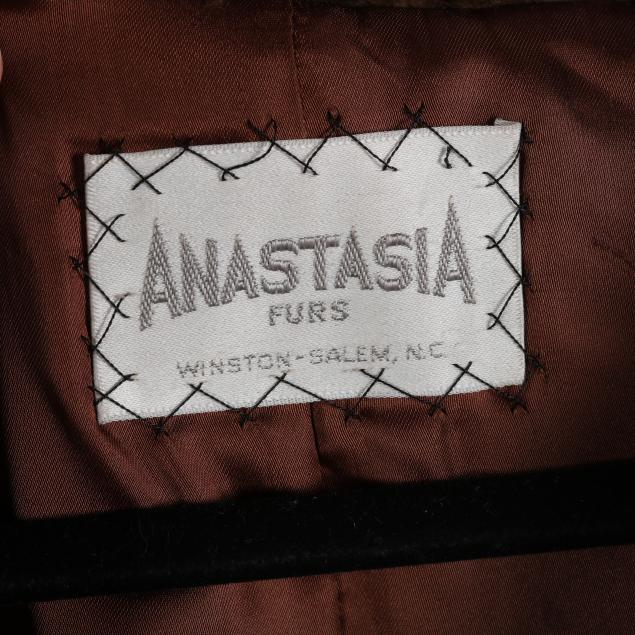 Composed of warm brown fur, having a small stand-up collar, chevron pattern, raglan sleeves with cuff, elasticized waist, zipper front closure, lined with "Anastasia Furs" label. With narrow mink 36 in. neck scarf included.