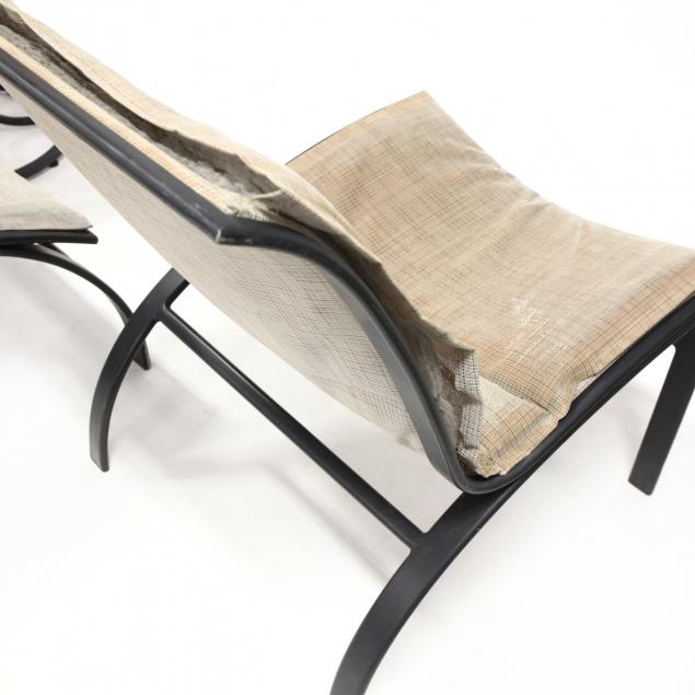 Club chair upholstery in poor condition with staining, tears to seams; one low table missing glass top; other staining and signs of outdoor use.