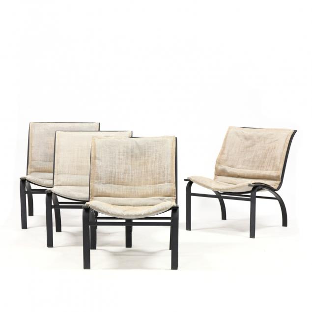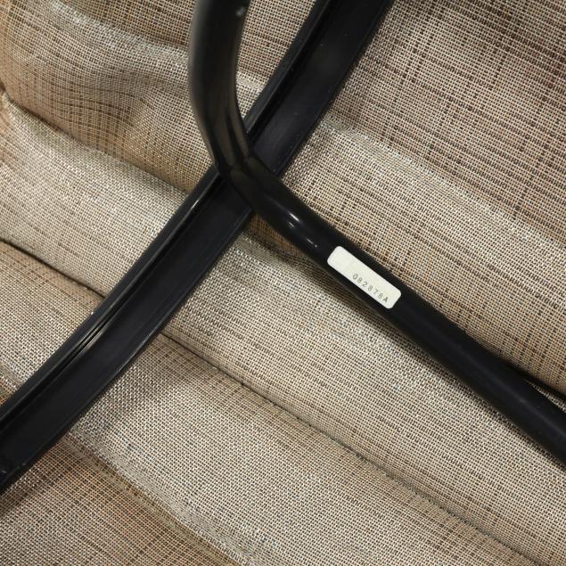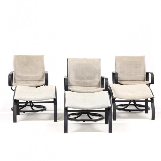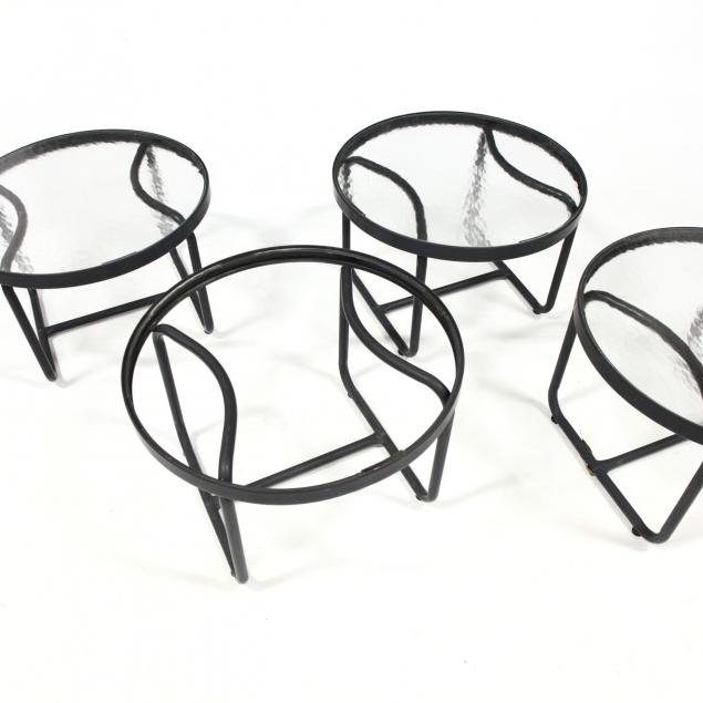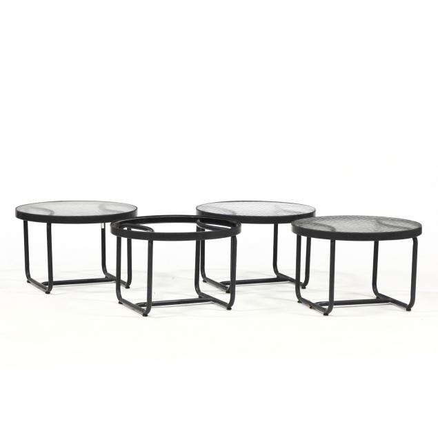 Late 20th century, black painted aluminum, including three swivel armchairs, four armless club chairs, three conforming ottomans, and four circular low tables with inset glass tops.