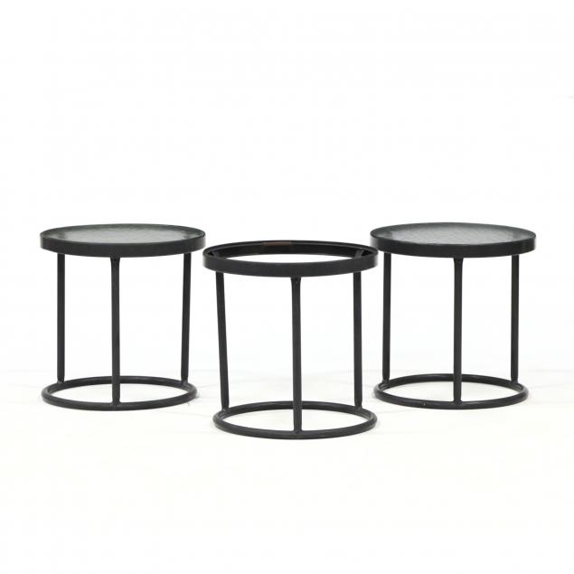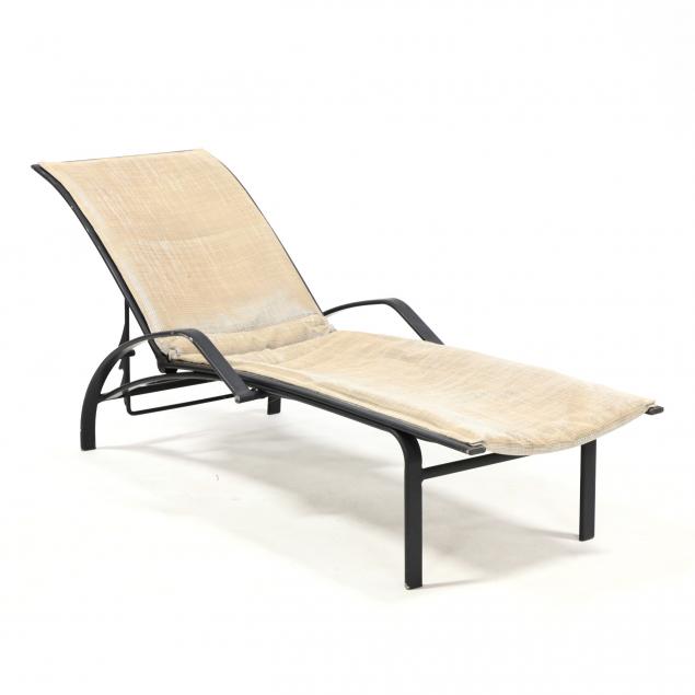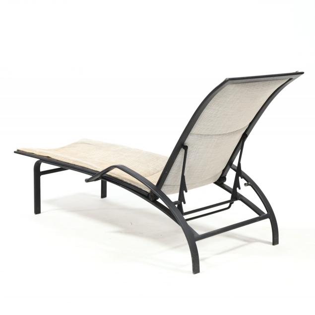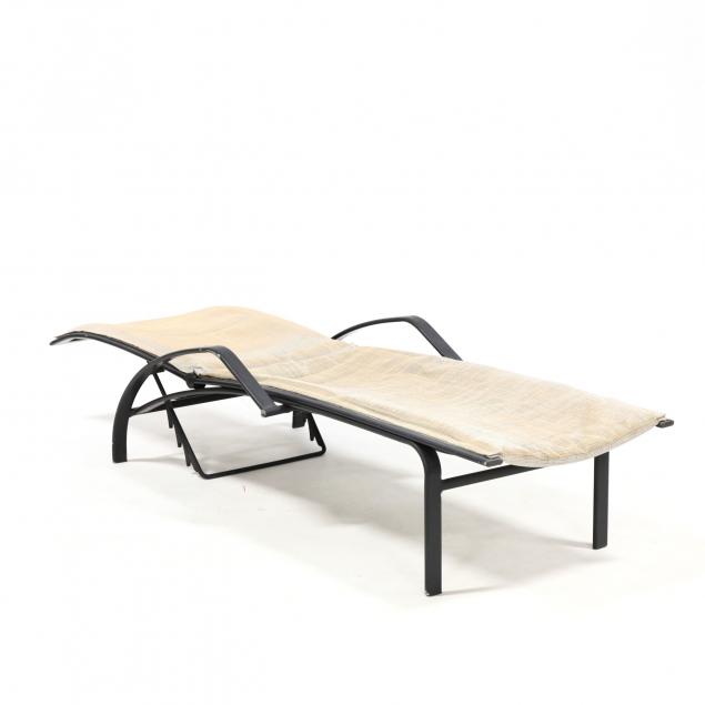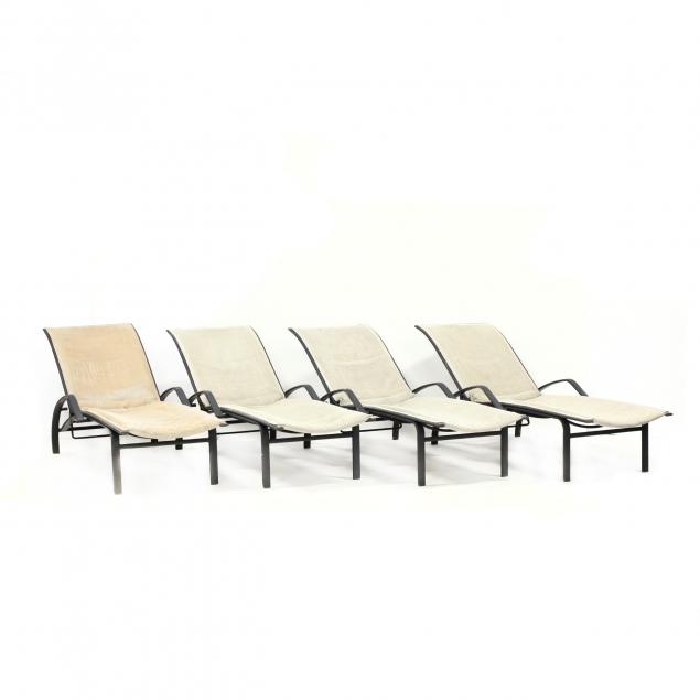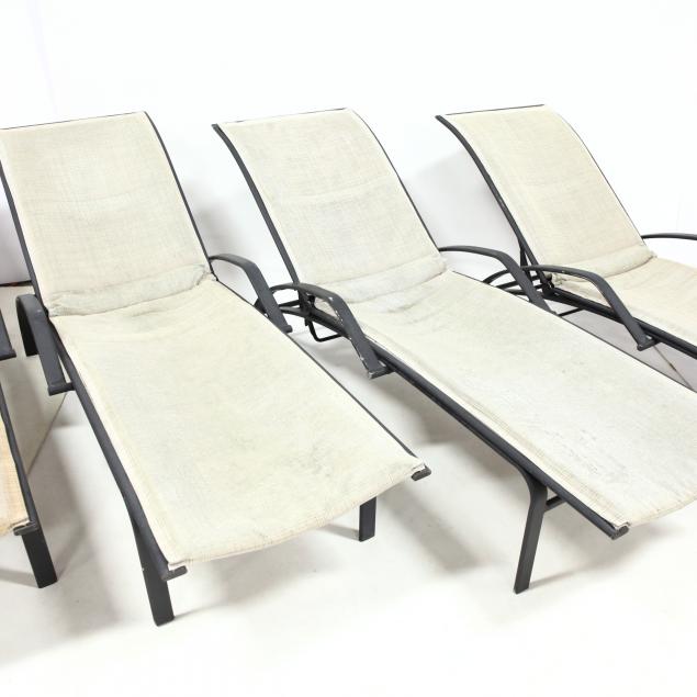 Late 20th century, black painted aluminum, to include four adjustable chaise lounges with woven upholstered back and seat, and three circular low tables with inset glass tops, labeled.
