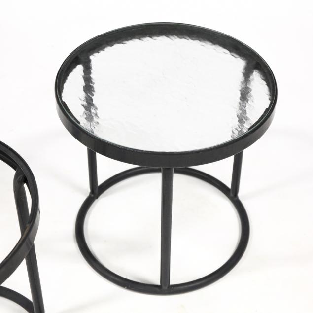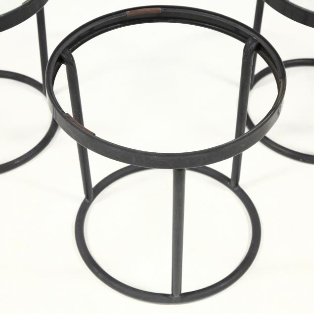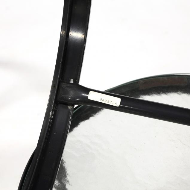 From the Collection of Peggy W. Hollander, Martinsville, VA Upholstery in fair to poor condition with fraying, stains and signs of outdoor use; scuffs and paint loss to frames; missing one glass top.
