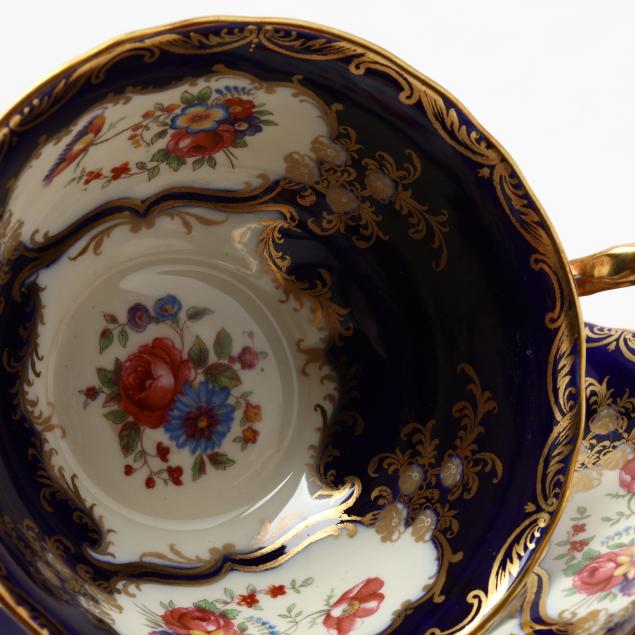 Mid 20th century, cobalt rims with floral and gilt highlights, complete service for twelve, including dinner plates (10.5 in.), luncheon plates (8.25 in.), bread plates (6.25 in.), teacups and saucers, and bouillon and underplates, marked.