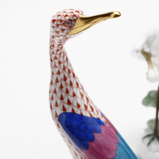 A composition of natural Spoonbill Cranes (9.25 in.); a rust fishnet pair of geese (7 1/8 in.); and a Kingfisher with catch in rust and green fishnet (9 in.).