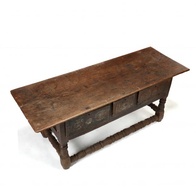 17th century, rectangular one board top, three side-by-side lipped drawers with relief carved shell, rosettes, and chip carving, paneled sides, boldly turned legs and stretcher base.
