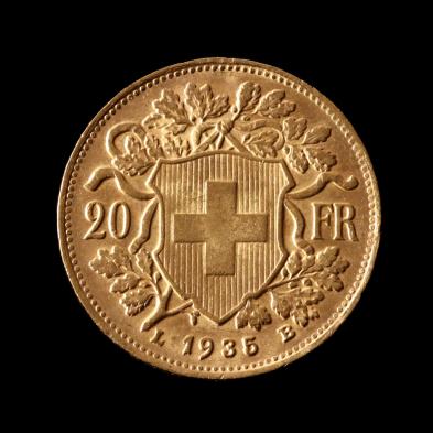 (6.45g), 0.1867 oz. AGW, Uncirculated, KM 35.1. The Standard Catalog of World Coins states that the 1935L-B coins were actually struck between 1945 and 1947. A representative coin is pictured rather than the actual lot.
